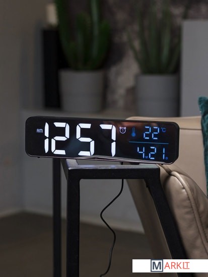 Особенности:— Простой лаконичный дизайн— Яркий контрастный экран с крупными цифрами— Регулируемая яркость— Качественный приятный звук будильника— Запоминание настроек при отключении питания— Отображение даты и температуры воздуха