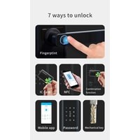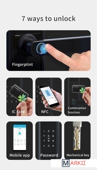 7 способов разблокировки: отпечаток пальцаIC картаNFCчерез мобильное приложениепарольключкомбинация нескольких способовКогда аккумулятор разряжен, его можно запитать от аварийного источника питания и использовать в обычном режиме.Размер - 370 мм*75 мм*24 мм