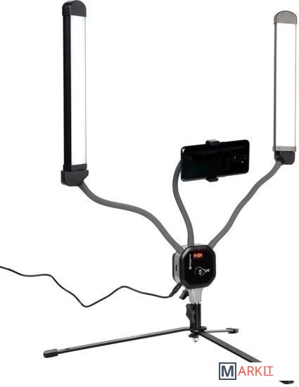 Комплектация Осветитель с 2 светодиодными панелями и блоком управленияАдаптер для смартфонаДержатель для смартфонаВинтовой зажимСетевой адаптерКабель питанияРуководство по эксплуатацииГарантийный талон