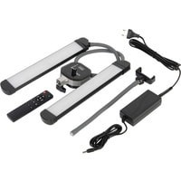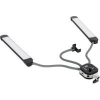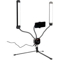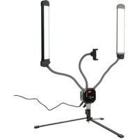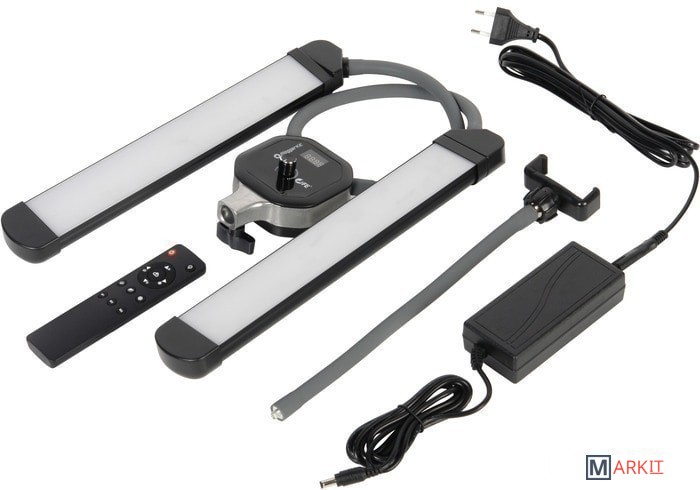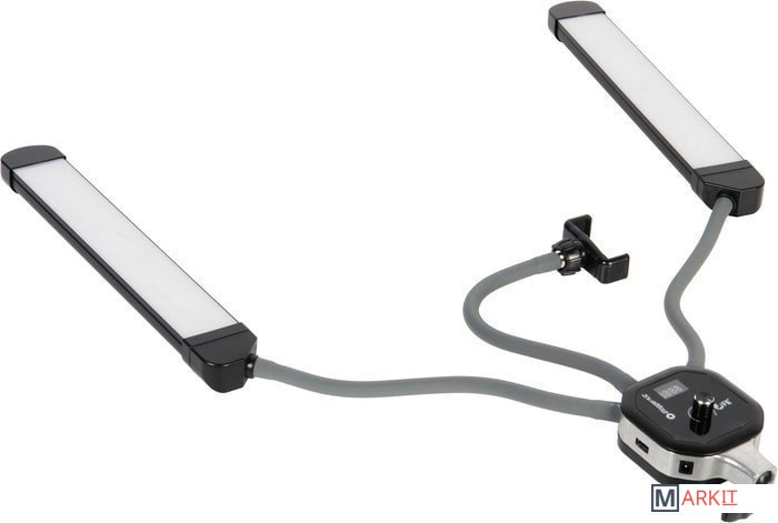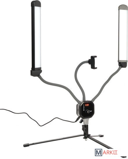 Моноконструкция с 2 LED-панелями bi-color, мощность 40 Вт, плавная регулировка цветовой температуры 3000–6000 К, плавная регулировка мощности 0–100%, установка на шпигот 5/8", держатель для смартфона шириной до 86 мм, USB-порт.